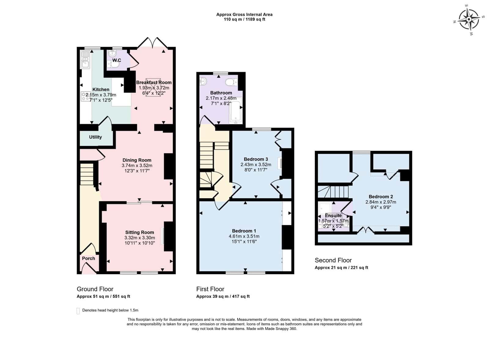 Two open plan ground floor receptions leading to a full width kitchen/breakfast room with utility & W.C. Upper floors house three double bedrooms and two bathrooms.
