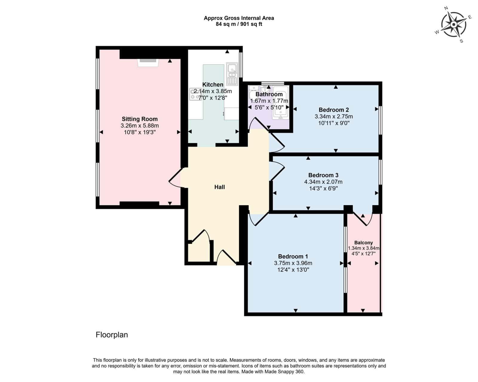 Large central entrance hall with space for study desking, triple windowed front sitting room, modern fitted kitchen, three piece bathroom and three bedrooms (two double and a generous single with balcony access).