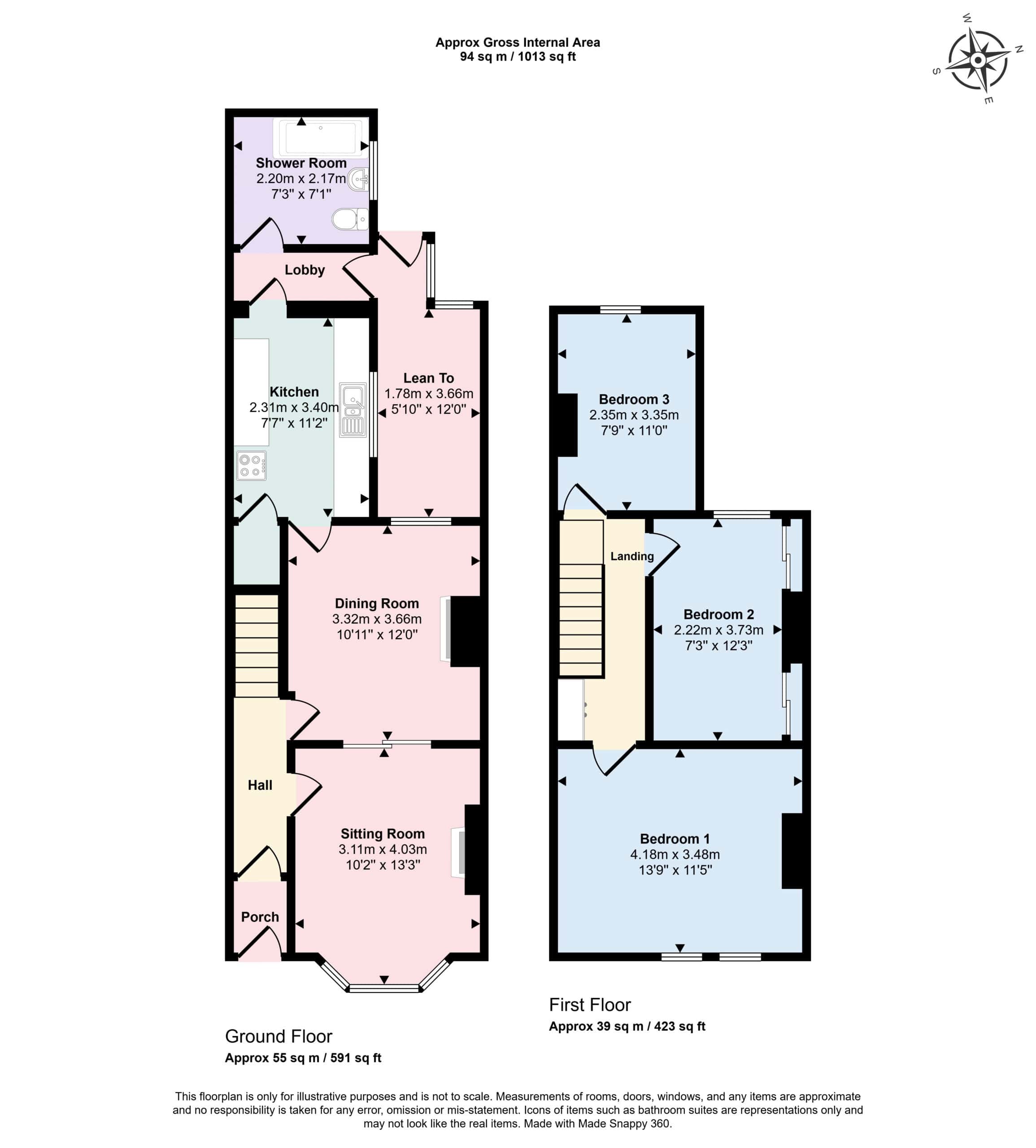 Ground floor hall, sitting room open plan to dining room, kitchen, lobby, shower room and lean to utility. First floor landing and three bedrooms.