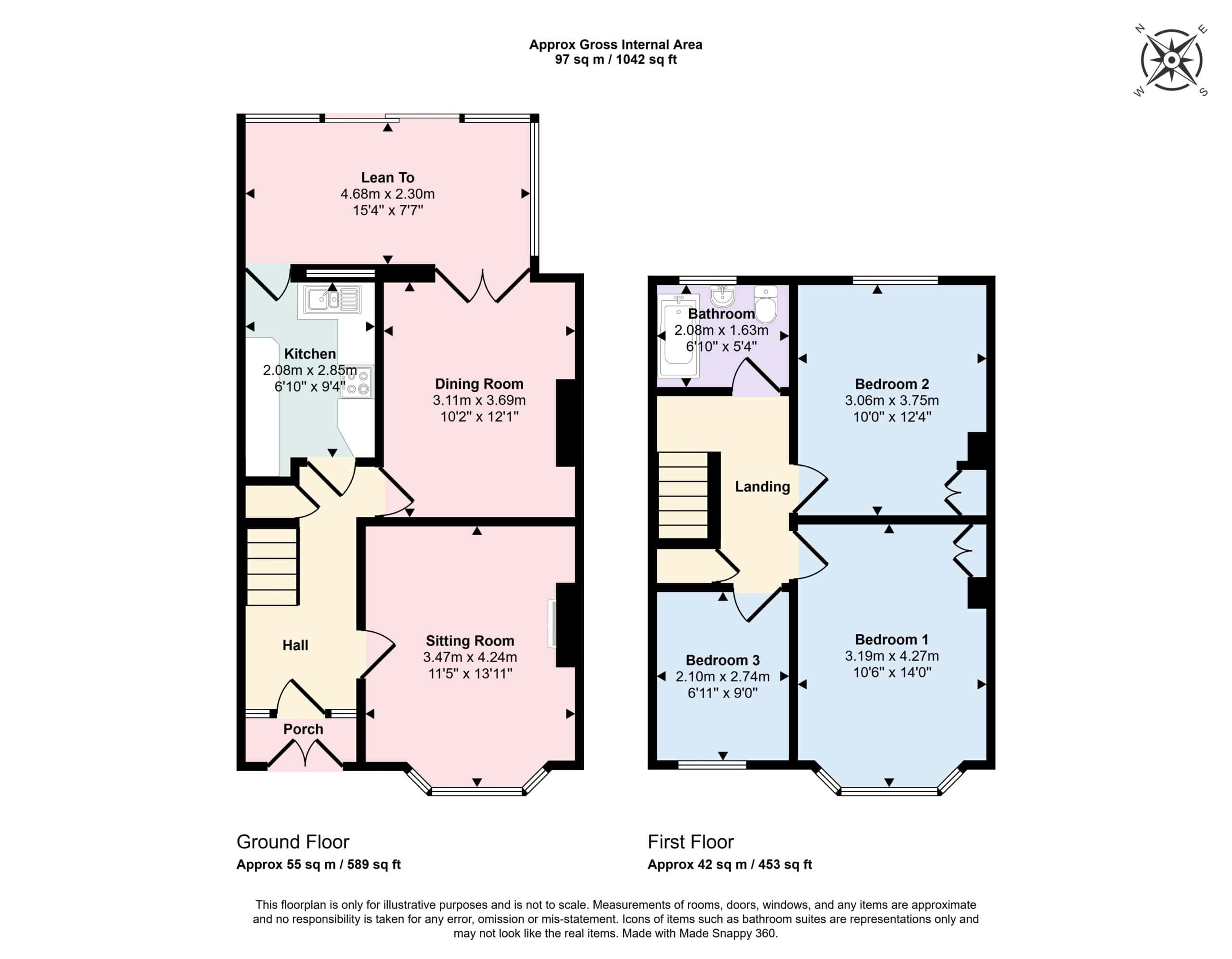 Ground floor porch into hallway, bayed sitting room, kitchen, dining room and rear lean to conservatory. First floor landing, three bedrooms and bathroom.