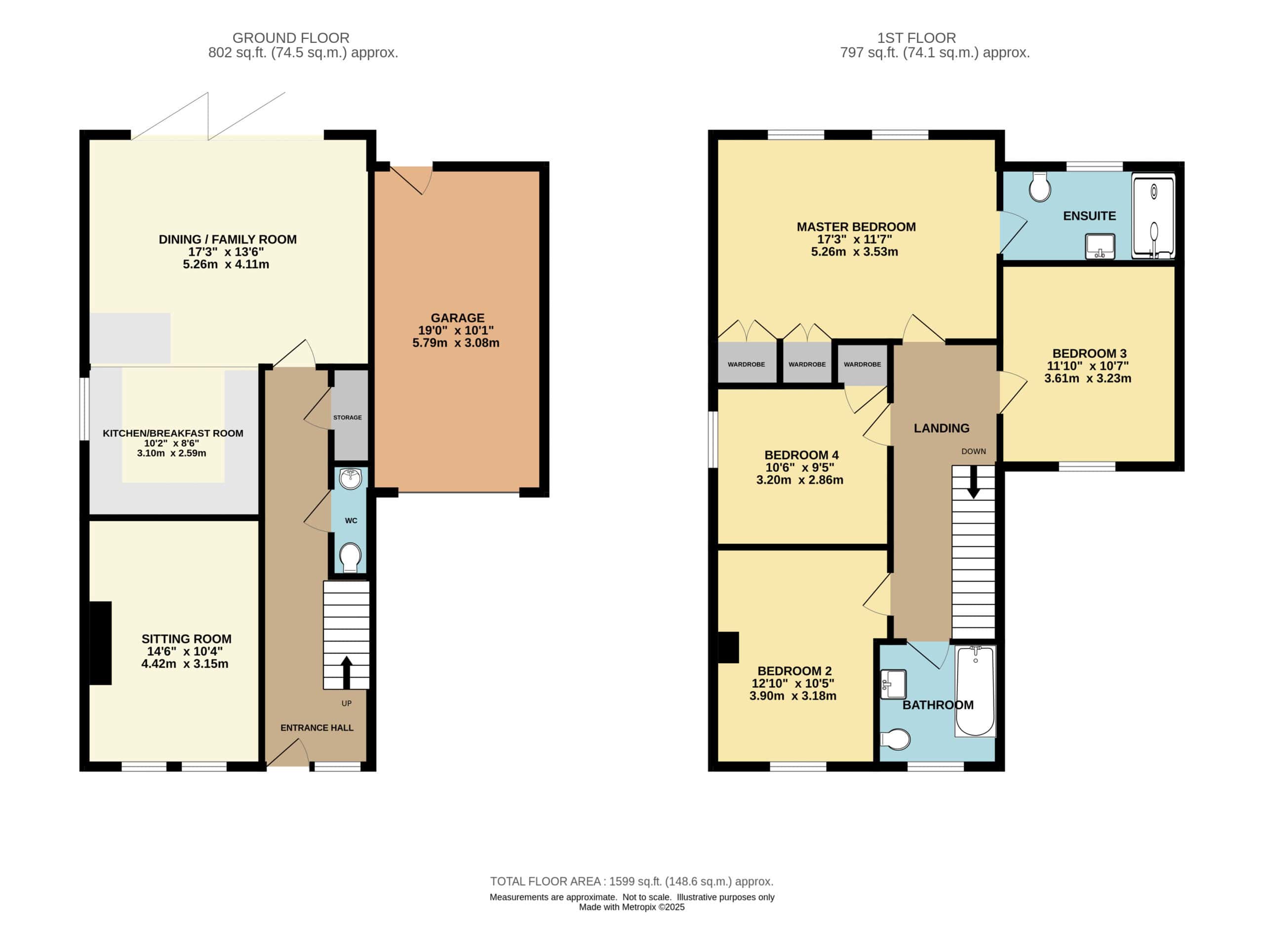 Large hall, sitting room, W.C and a family friendly dining room open plan to kitchen on the ground floor. Upstairs houses four generous bedrooms (all doubles and master with ensuite) plus family bathroom.