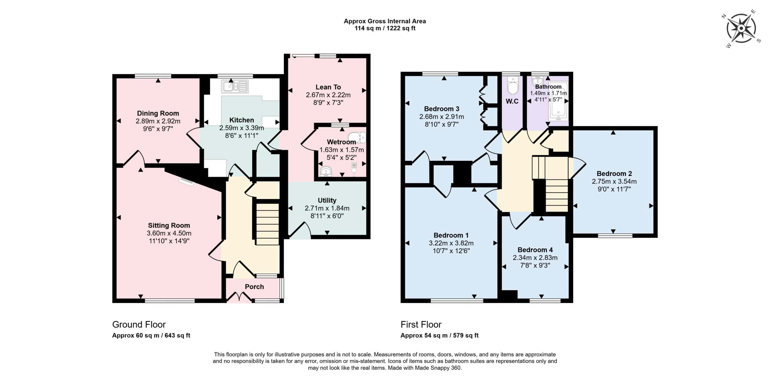 Ground floor porch into hallway, sitting room, dining room, kitchen, side lobby, utility, wetroom and lean to. First floor landing, four bedrooms, bathroom and W.C.
