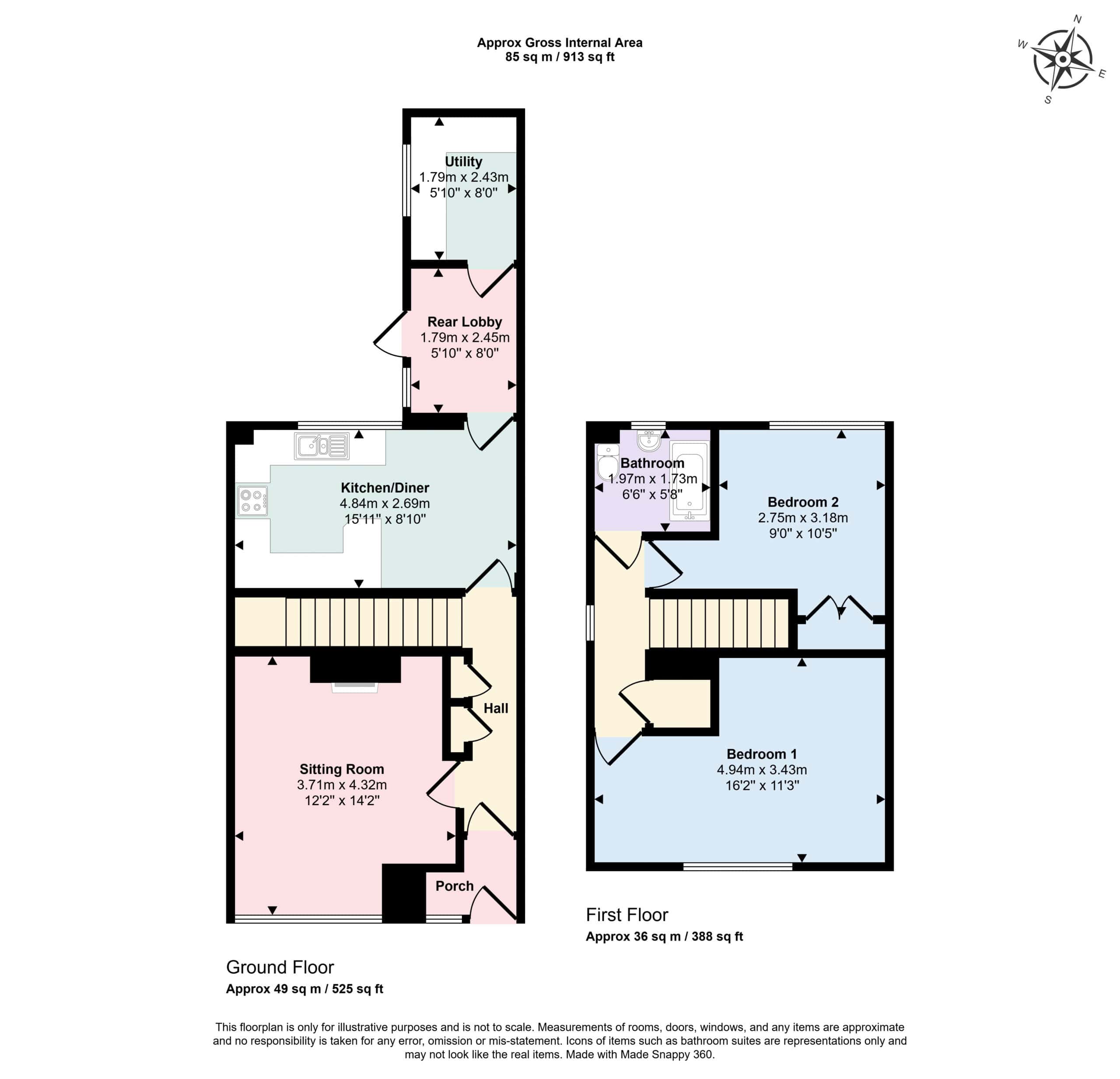 Ground floor porch and hall, front sitting room, kitchen/diner, rear lobby and utility room. First floor landing, two double bedrooms and bathroom.